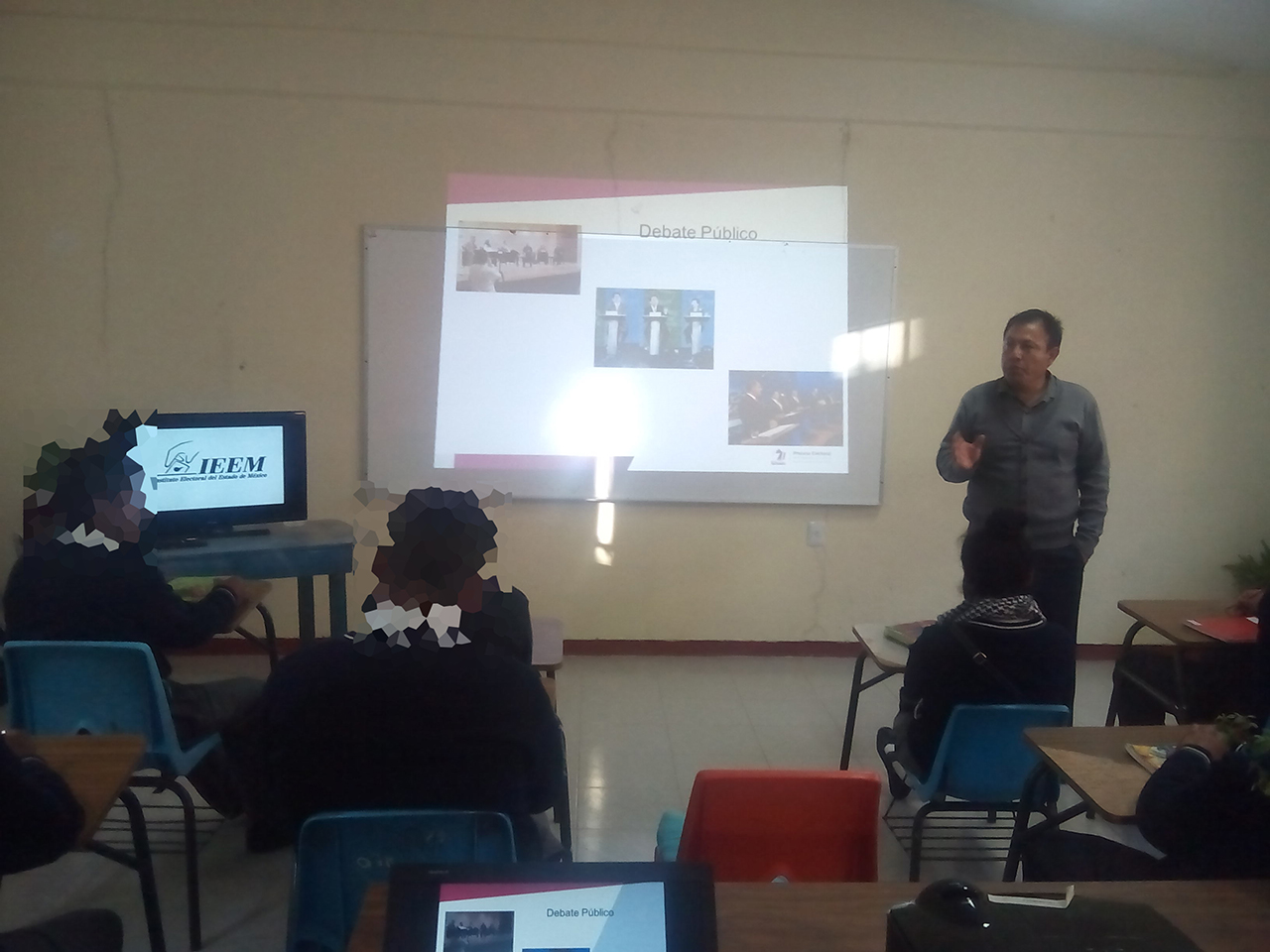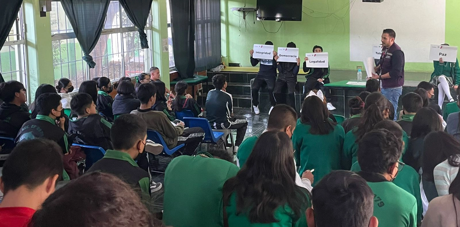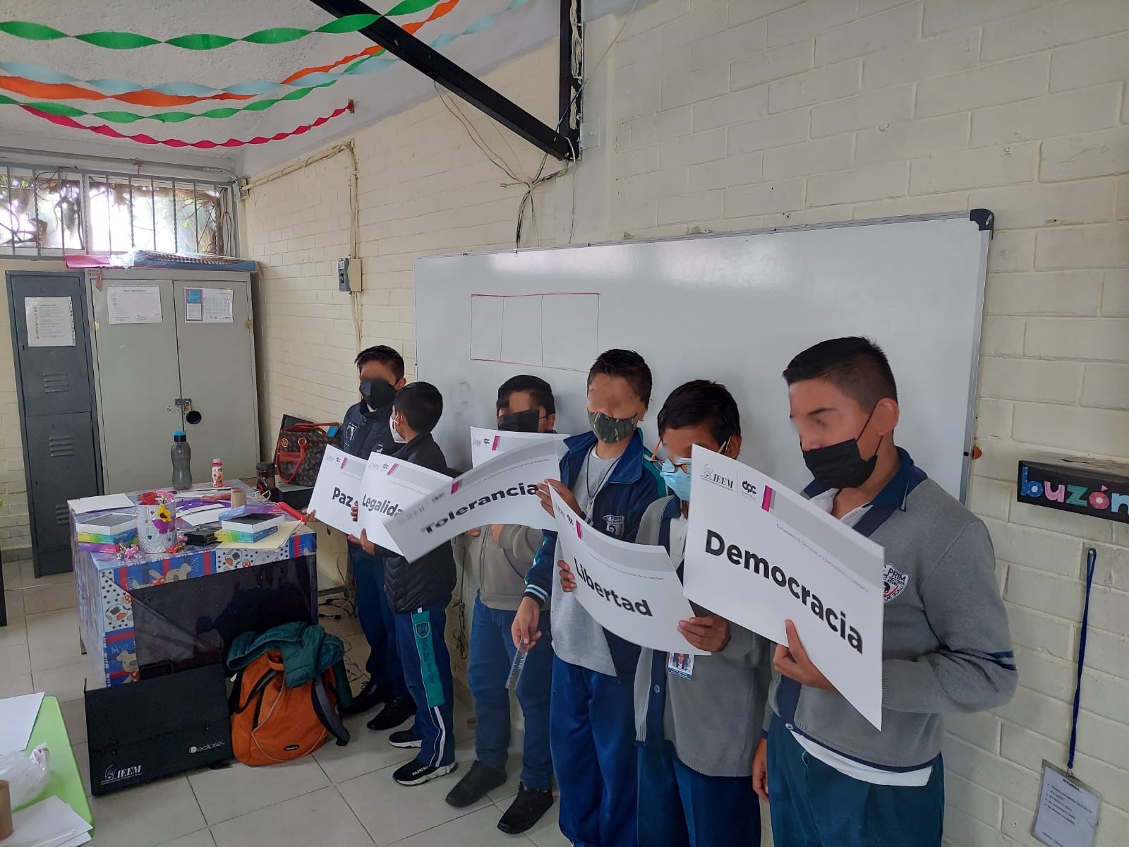 Es una sesión entre un/a expositor/a y un grupo escolar, con duración aproximada de 45 minutos, en la que interactúan por medio de técnicas expositivas y dinámicas grupales, en las que el público asume un rol activo para la construcción de conceptos a partir de palabras clave, al tiempo que quien expone retroalimenta la información con ejemplos y datos estadísticos que invitan a la reflexión sobre el estado que guardan los valores democráticos en nuestra sociedad contemporánea.
