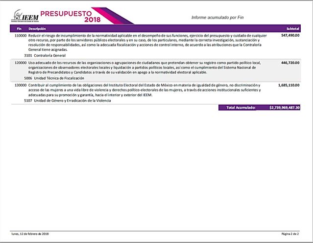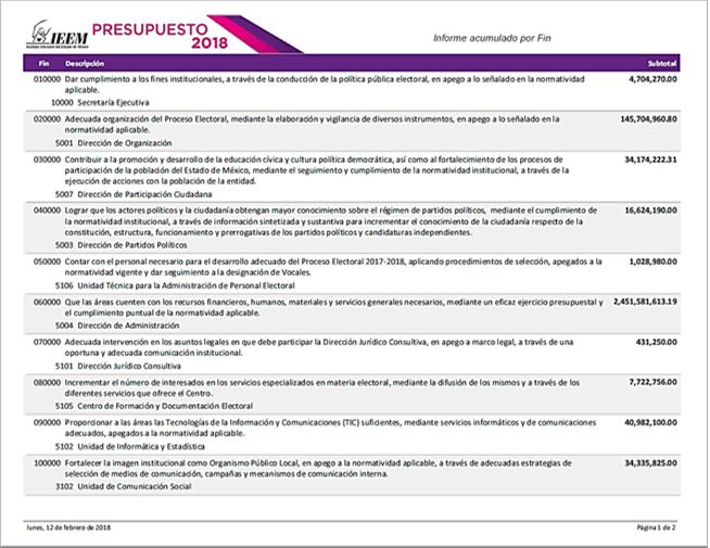 El Presupuesto basado en Resultados 2018 del Instituto Electoral del Estado de México, elaborado bajo la Metodología del Marco Lógico, fue aprobado por el Consejo General mediante Acuerdo No. IEEM/CG/28/2018, y está integrado como se presenta a continuación:
