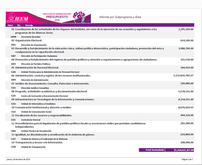 El Presupuesto basado en Resultados 2019 del Instituto Electoral del Estado de México, fue aprobado por el Consejo General mediante Acuerdo No. IEEM/CG/05/2019 y está integrado como se presenta a continuación: