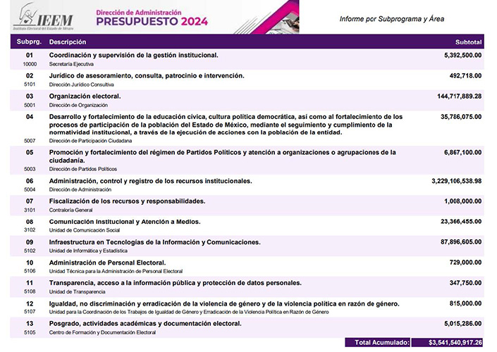 El Presupuesto basado en Resultados 2024 del Instituto Electoral del Estado de México, fue aprobado por el Consejo General mediante Acuerdo No. IEEM/CG/108/2023 y está integrado como se presenta a continuación: