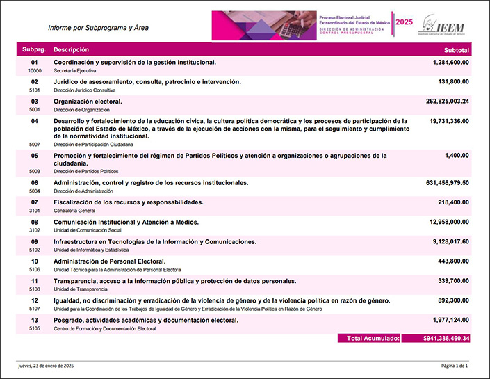 El Presupuesto basado en Resultados 2025 del Instituto Electoral del Estado de México, fue aprobado por el Consejo General mediante Acuerdo No. IEEM/CG/13/2025 y está integrado como se presenta a continuación: