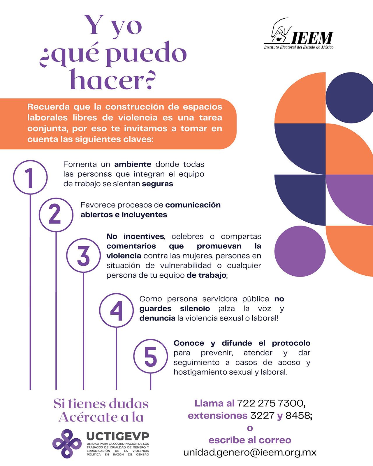 Además, es el primer punto de contacto, del personal del órgano central y desconcentrados, para los casos de acoso y hostigamiento sexual y laboral.